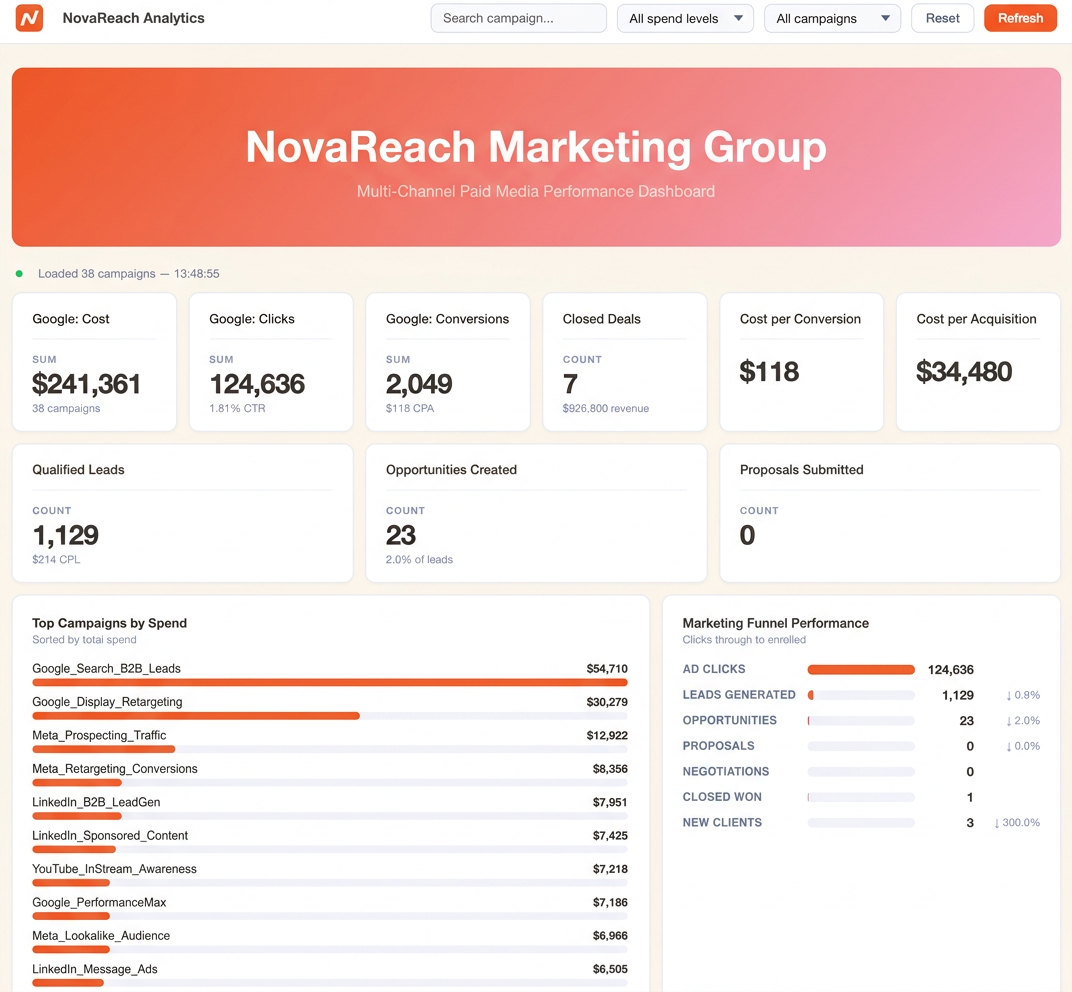 Pulling data from multiple sources, cleaning it, and putting it somewhere useful. Google Sheets automation, cross platform reporting, automated data aggregation. One project involved pulling ad data from Google, Meta, and LinkedIn, matching it to CRM pipeline data, and surfacing insights that were invisible when the reporting was manual.