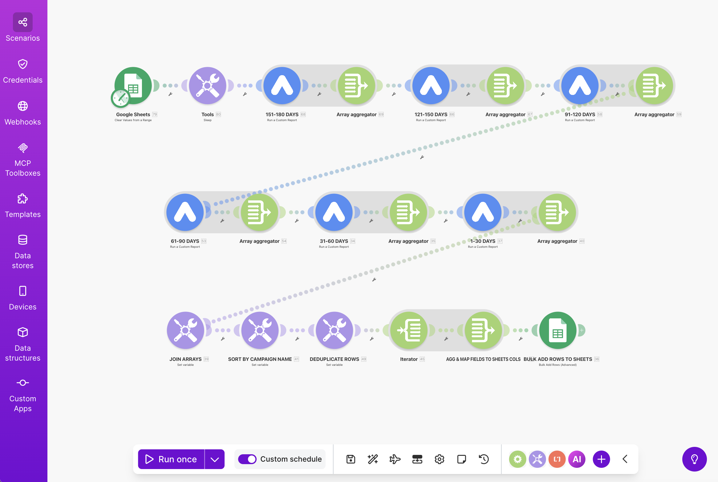Pulling numbers from Google Sheets, ad platforms, CRMs, and trying to get them into one place that makes sense. By the time the report is done, the data is already out of date. I build systems that run at 2am so the report is ready before anyone gets to their desk. If you need a live dashboard on top of that, I build custom dashboards too.